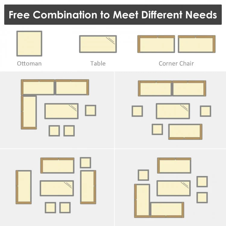 Free Combination and Modern Design: Including 3 corner chairs, 3 ottomans and 1 table, this rattan sofa set provides enough space for gatherings of family or friends and can be easily changed to different layouts based on your needs. More, this simple yet stylish sofa set can match well with any outdoor space including garden, patio, poolside, etc.