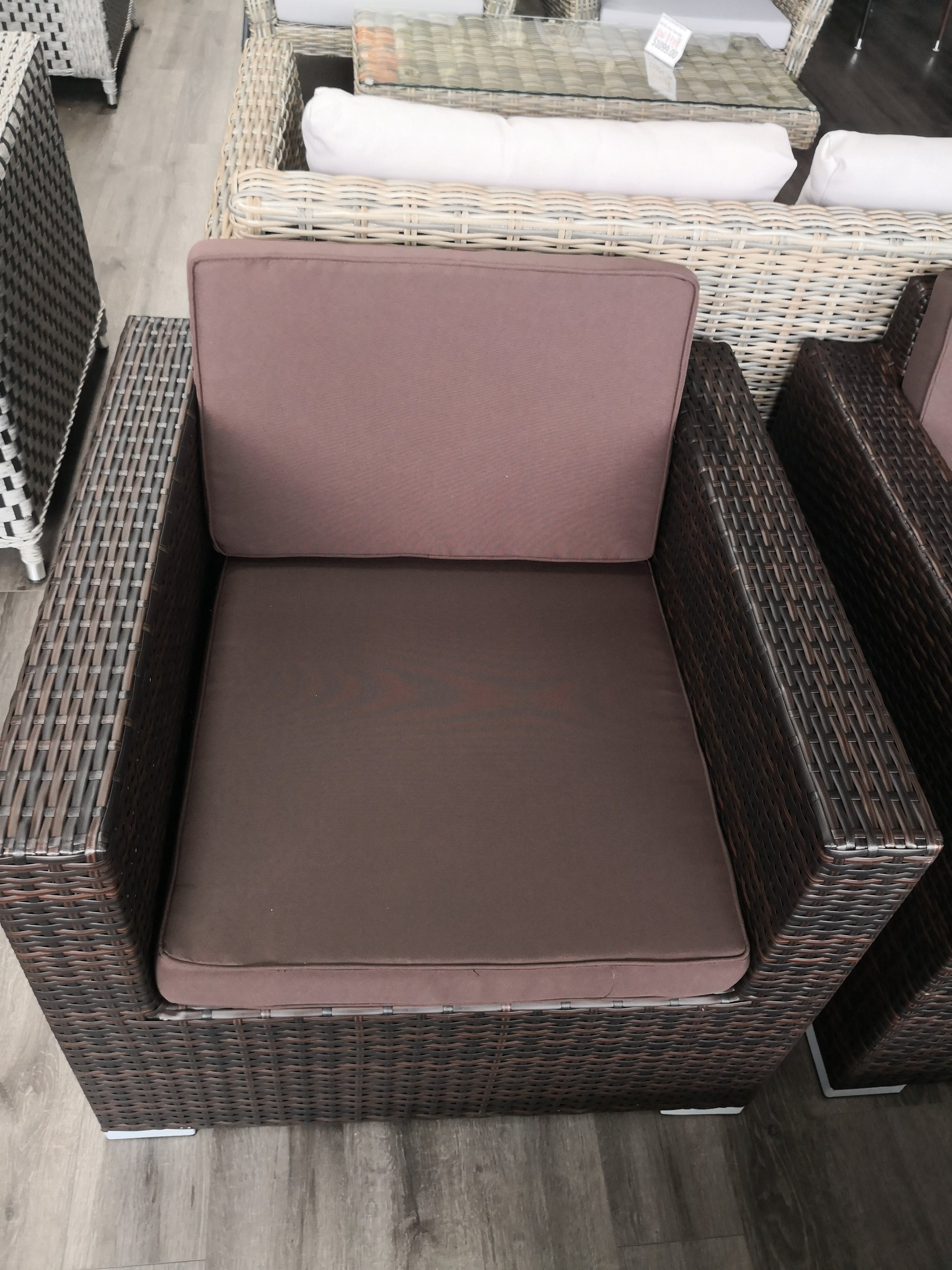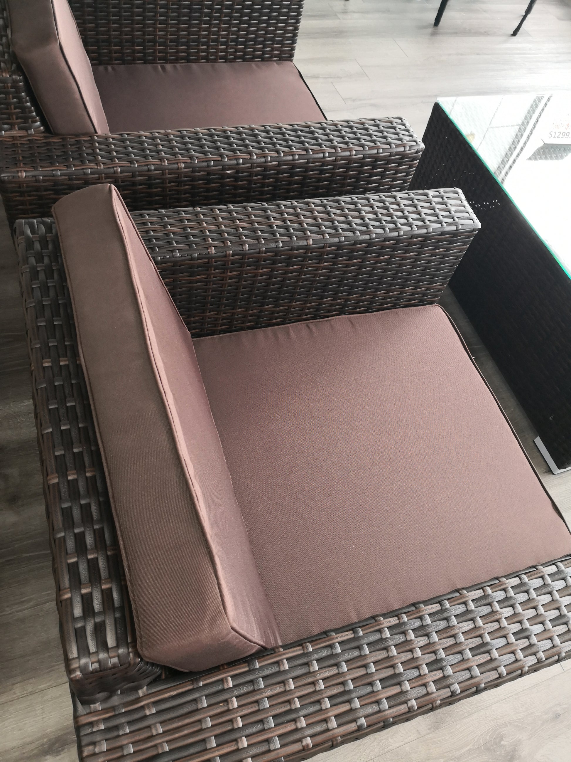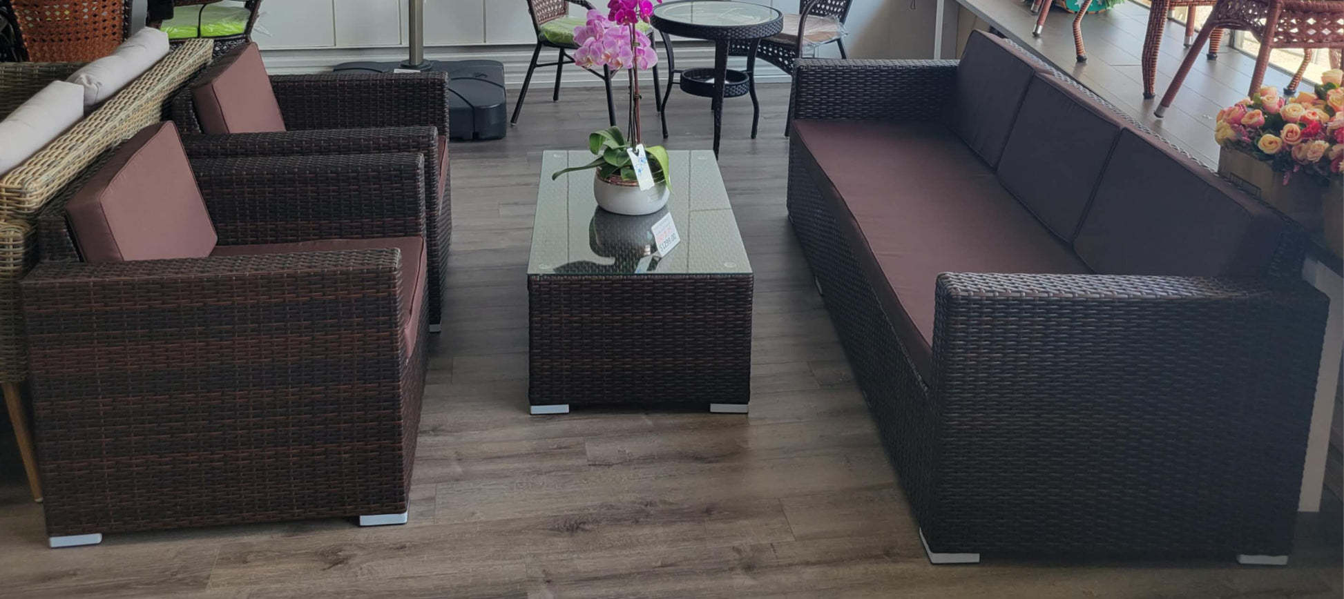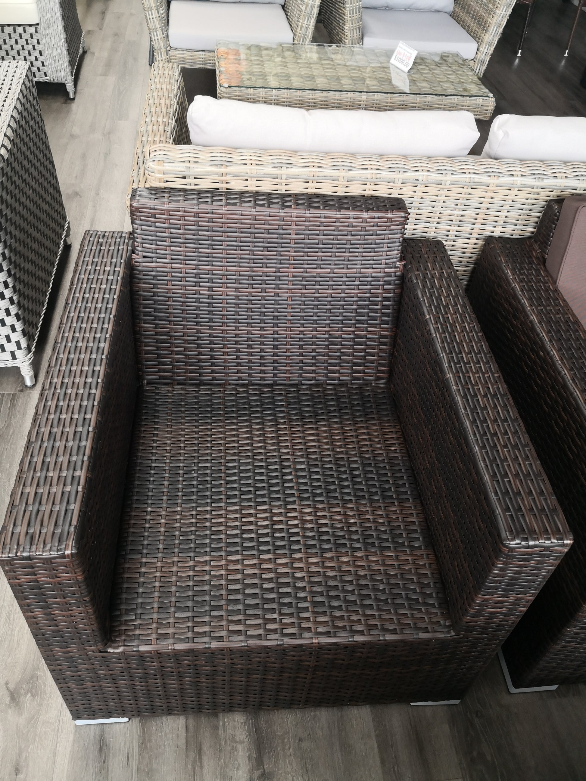 Destress in luxury with this collection. This outdoor seating set features a custom hand-woven, two-tone walnut-coloured wicker, Each piece is made with a metal frame wrapped in breezy two-tone walnut-coloured resin wicker which is crafted using a high-density resin material to ensure your seating set is built to withstand the elements.